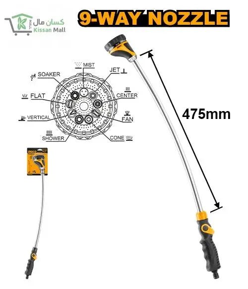 This versatile water wand features 9 different spray options for all your watering needs. With a durable and lightweight design, it is perfect for both indoor and outdoor use. From a gentle mist for delicate flowers to a powerful jet stream for cleaning, this nozzle will make gardening and household chores a breeze.Adjusetable angle,powder-coated metal headSize:28″9-spray patterns for all watering needs:mist,soaker,flat,vertical,shower,cone,fan,center,jetTPR insulated comfort grip”U” style ON/OFF designShipping and delivery all across pakistan